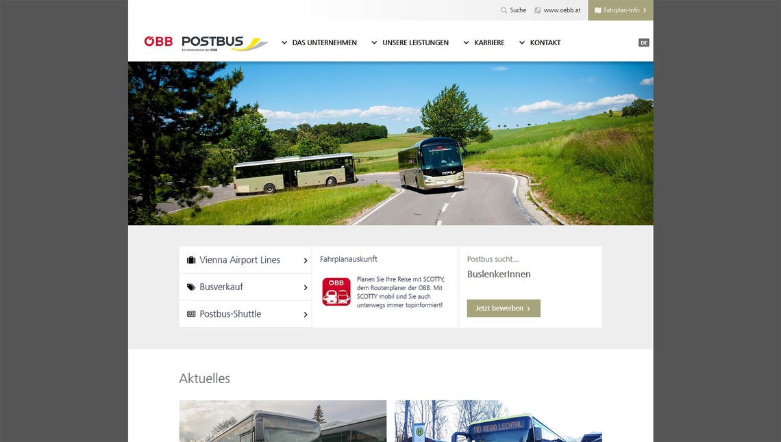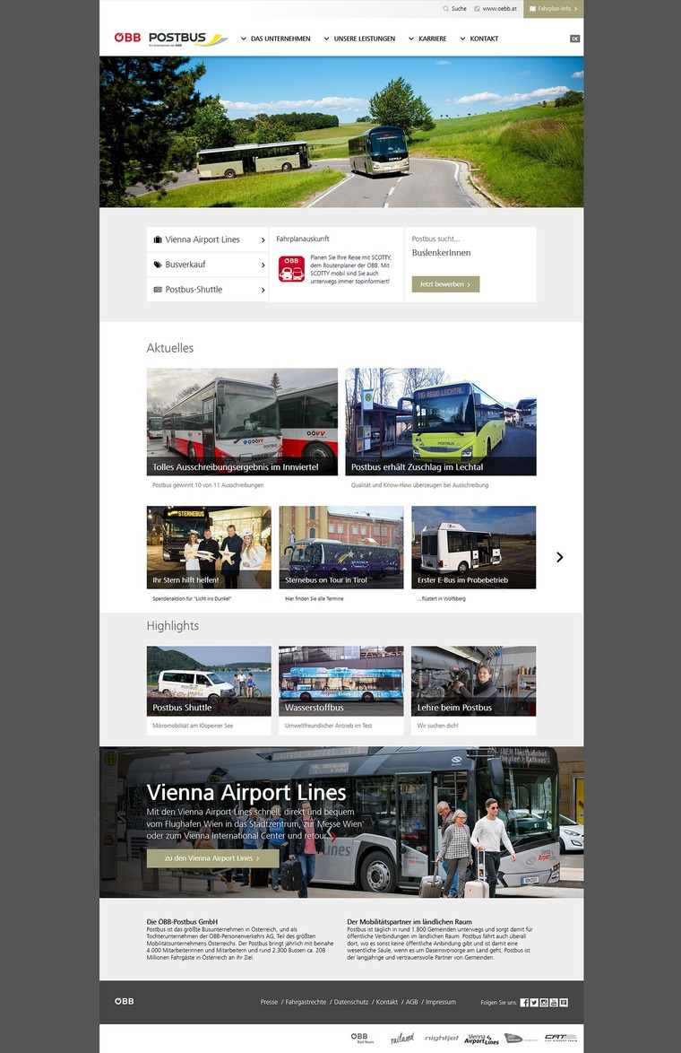 Ende 2018 hat ÖBB Postbus seinen Internetauftritt auf https://www.postbus.at/ komplett erneuert. Modernere Designelemente und neue Funktionen sorgen für zusätzliche Übersichtlichkeit und verbesserte Usability – so ist der Aufbau der jeweiligen Seite dank dem modularen Design sehr individuell möglich. Für einfacheres Navigieren erhielt die Website ein übersichtlich designtes Menü mit einfach strukturierter Untermenü-Ebene. Dort finden sich beispielsweise Informationen zum Unternehmen sowie zu Karrieremöglichkeiten beim größten Busunternehmen Österreichs. Darüber hinaus gibt es reichlich Informationen zu den unterschiedlichen Leistungen von Postbus, vom regionalen Linienverkehr über die Vienna Airport Lines bis hin zu den Skibussen.