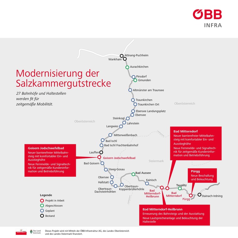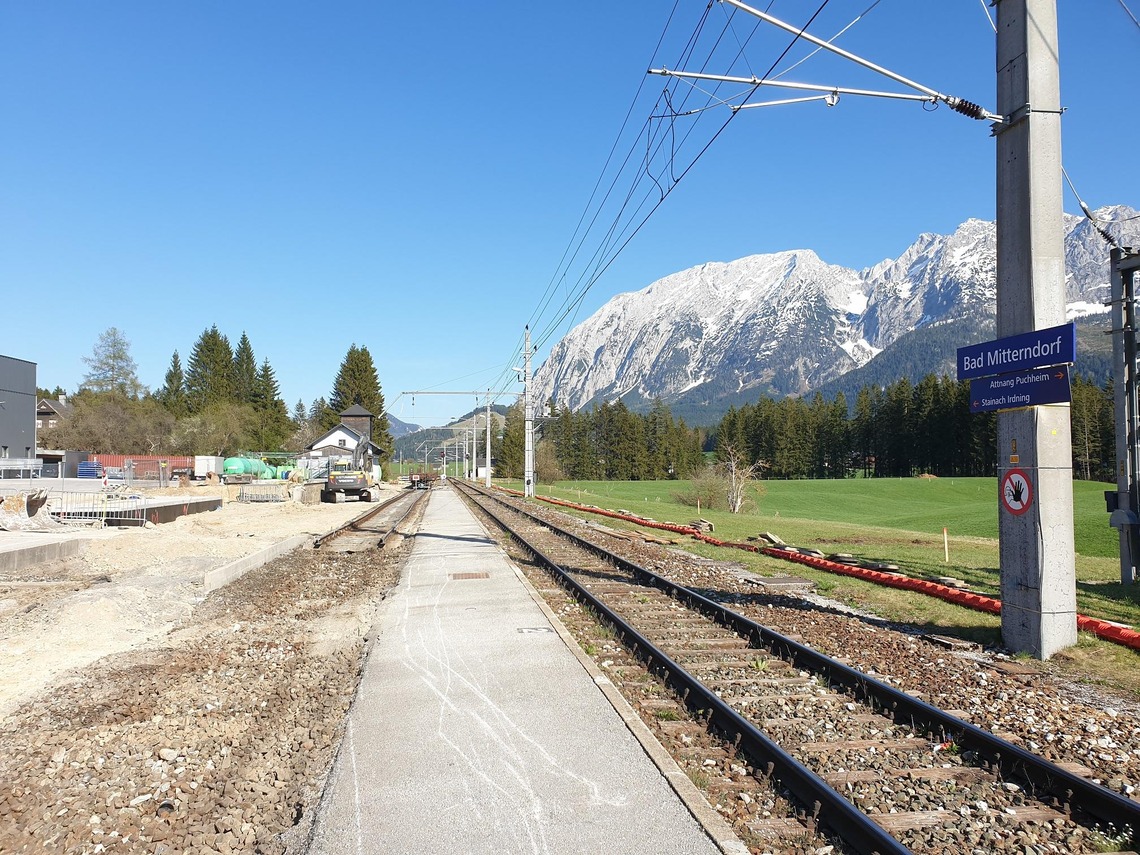 Seit April bis voraussichtlich Herbst werden der Bahnhof Bad Mitterndorf und die Haltestelle Bad Mitterndorf-Heilbrunn modernisiert. Neben den Bahnsteigen in beiden Stationen und dem Wartebereich der Haltestelle Bad Mitterndorf-Heilbrunn werden die Beschallung und Beleuchtung erneuert. Der Bahnhof Bad Mitterndorf wird barrierefrei. Dazu werden Gleise umgebaut und erneuert, um Platz zu schaffen für einen neuen, barrierefreien Mittelbahnsteig. Die erhöhte Bahnsteigkante ermöglicht künftig den komfortablen Ein- und Ausstieg in die Züge des Nahverkehrs. Moderne Ausstattung sowie neue Beschallung und Beleuchtung sorgen für noch mehr Qualität.