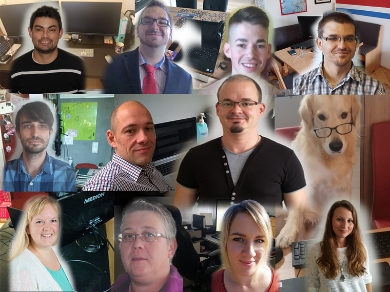*1. Reihe v. l. n. r.: Ralph Schiffmann, Michael Kössl, Jürgen Celerin, Alexander Coufal / 2. Reihe: Ge- org Stingel, Reinhold Wagner, Mathias Fuchs, Balu / 3. Reihe: Daniela Fröhlich (Karenz), Birgit Gelich, Melanie Gugg, Tina Mogg (Karenz).