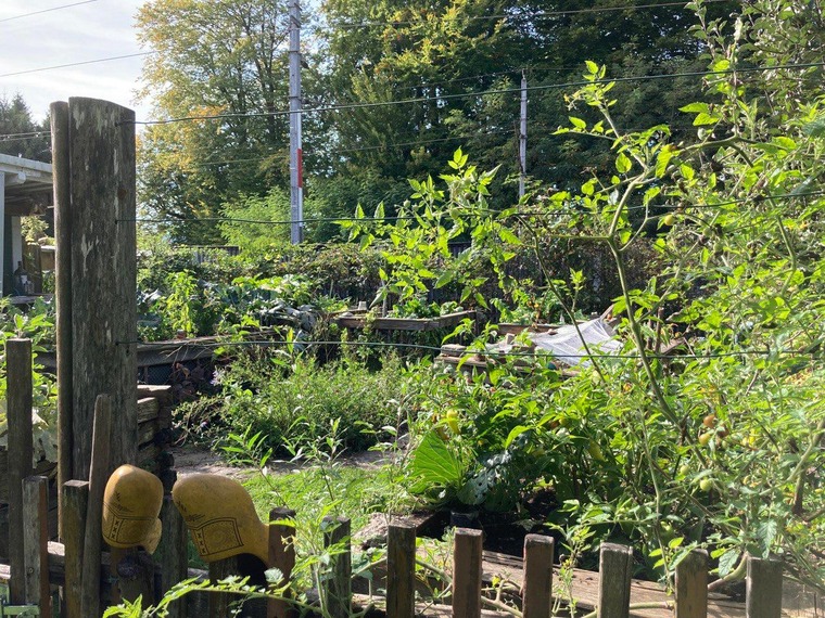 Betritt man den Garten, hat man sogleich das Gefühl, komplett in einem wunderbar eigenständigen Ökosystem zu stehen. Steingarten, Erdäpfelbeet, Bienen und Hochbeete säumen das Grundstück. Am Rand wird schon fleißig Gras fürs Mulchen getrocknet und an den Obstbäumen hängen die reifen Äpfel: Eine wahre Herbstidylle. Dazwischen fährt immer wieder einmal gemächlich ein Güterzug vorbei. Das lässt das Eisenbahner:innen-Herz höher schlagen.