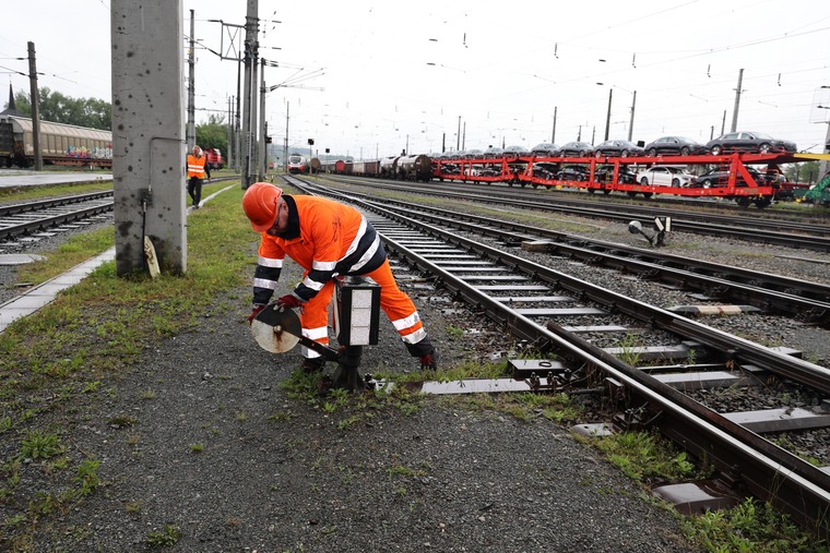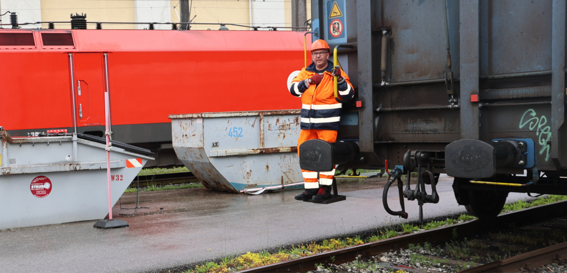 Der Job ist echt abwechslungsreich: Balazs fährt jetzt als Verschieber am Waggon mit und gibt dem Lokführer per Funk den Abstand bis zum Haltepunkt durch.