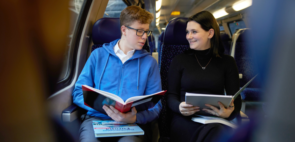 Laura und Niklas freuen sich, wenn sie unsere Kund:innen während der Zugfahrt betreuen können. Sie sind dann u. a. für die Qualitätssicherung mitverantwortlich.