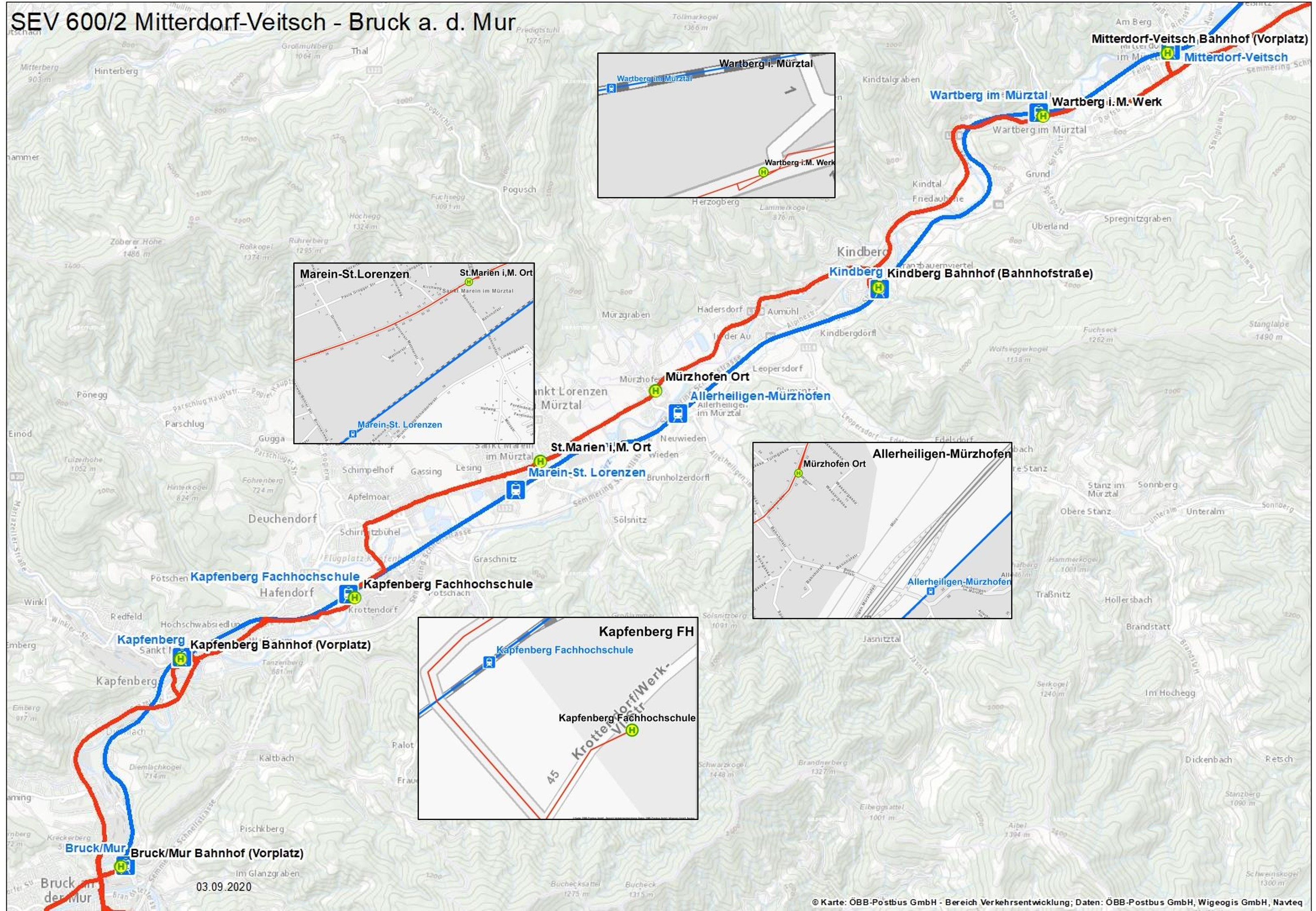 Ein Schienenersatzverkehr ist für Züge der Linie S1 und REX zwischen Frohnleiten und Bruck a. d. Mur eingerichtet.