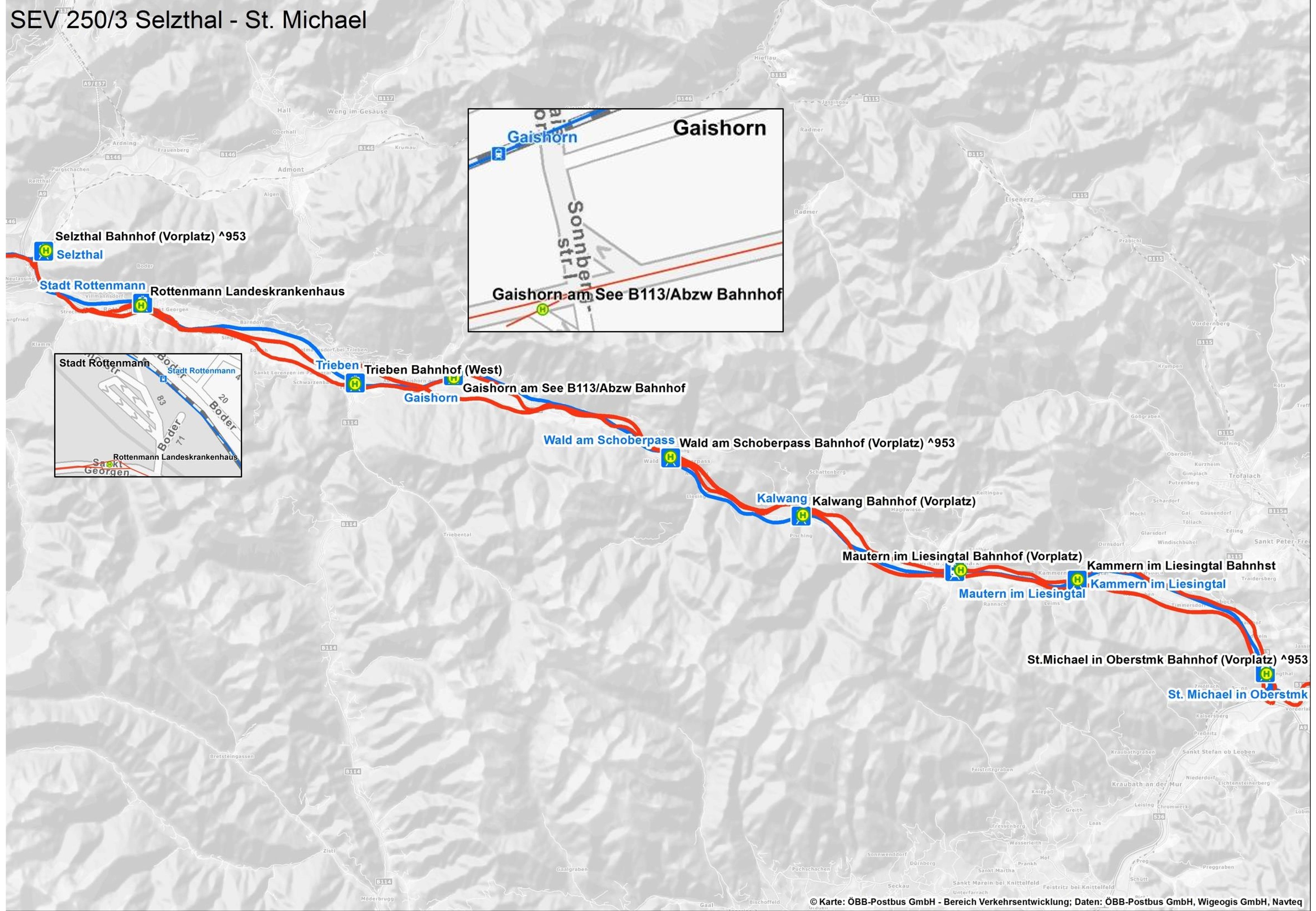 Ein Schienenersatzverkehr ist für Züge der Linie R9 zwischen St. Michael und Wald am Schoberpass bzw. Gaishorn eingerichtet.