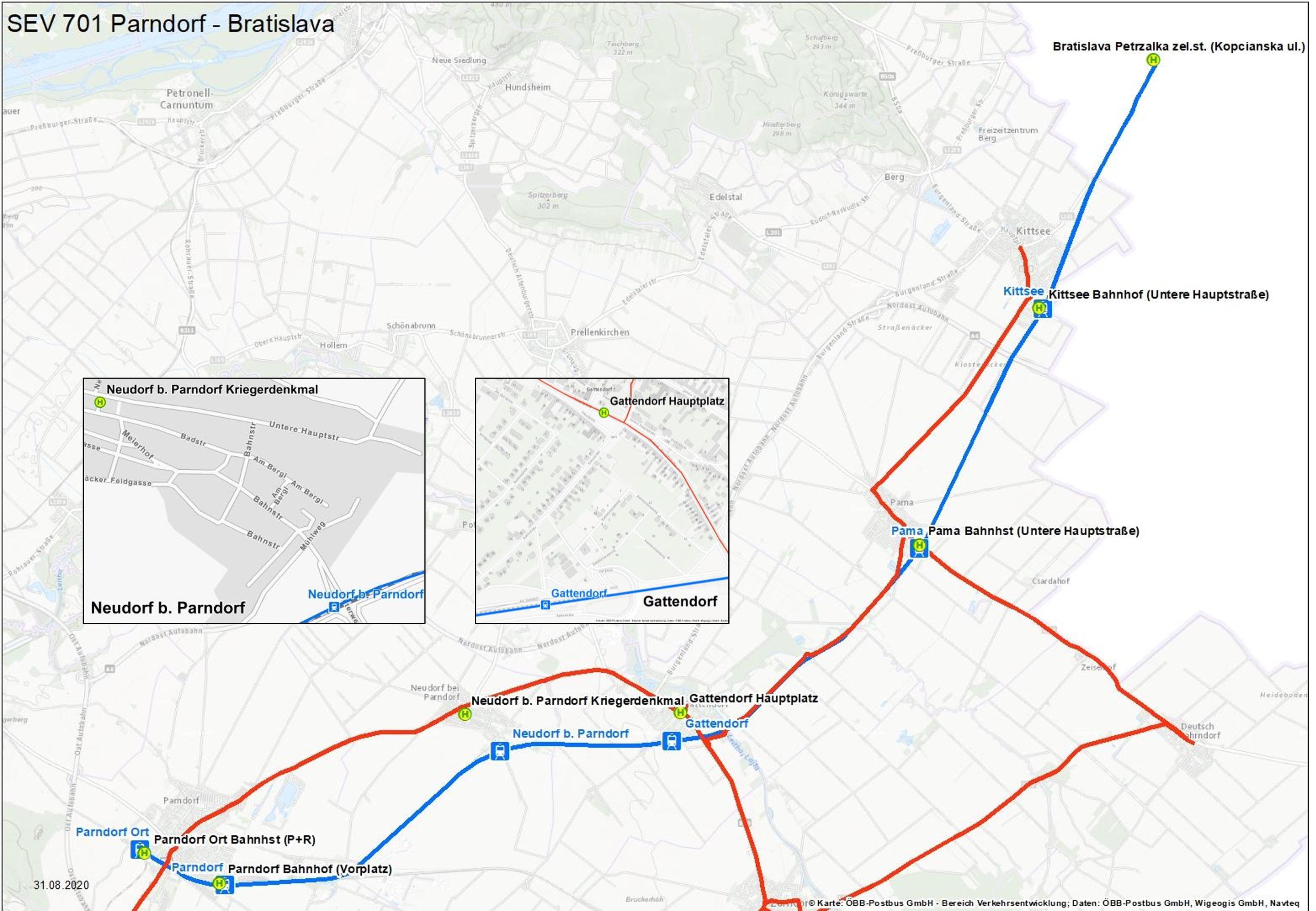 Ein Schienenersatzverkehr ist für alle Züge zwischen Parndorf und Bratislava-Petržalka eingerichtet.