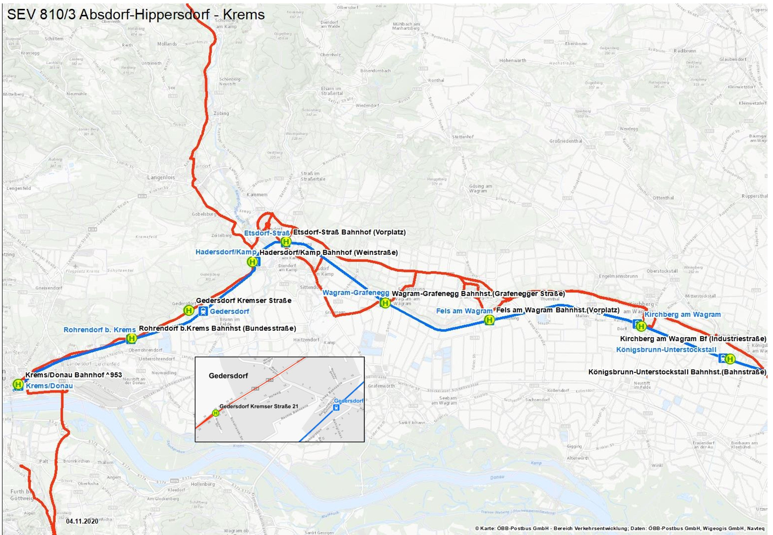 Ein Schienenersatzverkehr ist für alle Züge der Linie REX4 zwischen Absdorf-Hippersdorf und Krems a. d. Donau eingerichtet.