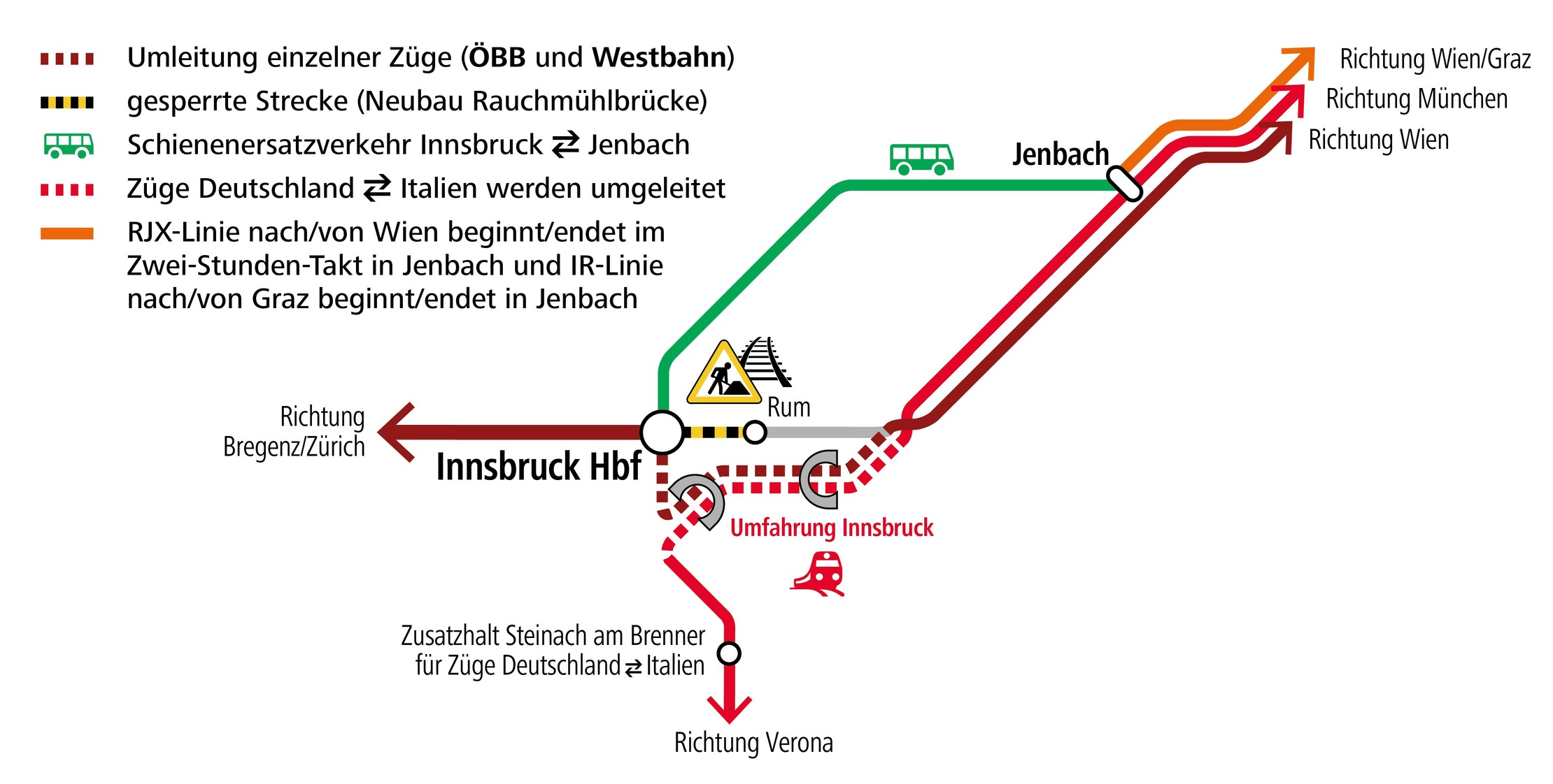 Ein Schienenersatzverkehr ist für einige Fernverkehrszüge zwischen Innsbruck Hbf und Jenbach eingerichtet. Einige Züge werden umgeleitet.