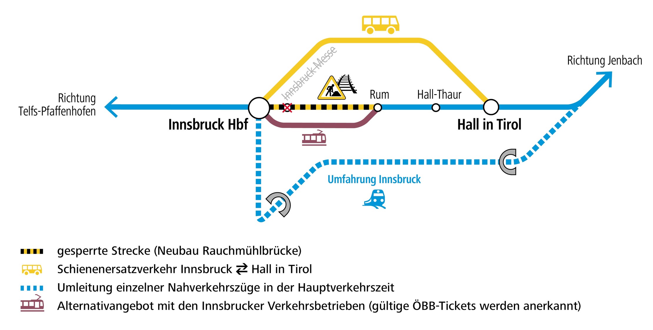 Züge der Linie REX2 fallen zwischen Innsbruck Hbf und Rum aus. Der Umstieg in Rum erfolgt auf das Alternativangebot der Innsbrucker Verkehrsbetriebe (IVB). Gültige ÖBB-Tickets werden anerkannt. Ein Zusatzhalt ist in Hall-Thaur eingerichtet.